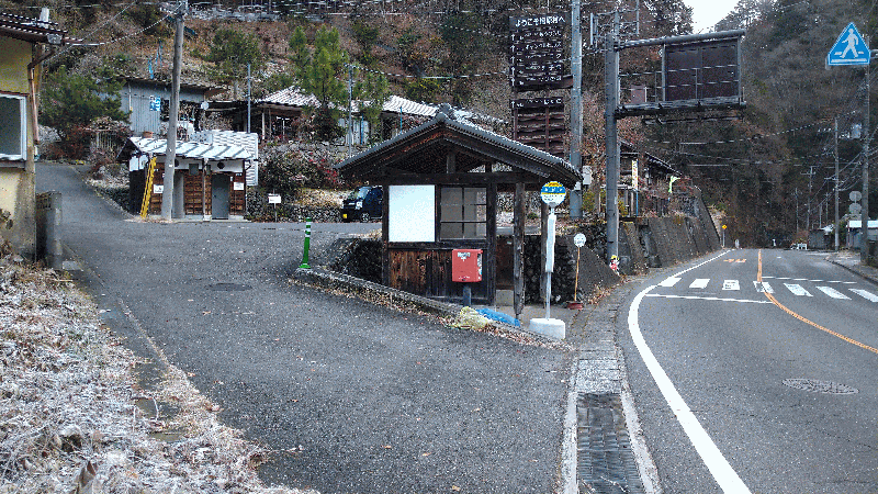 駐車場の前が上川乗停留所なので、そこから仲の平停留所まで、バスで移動します。480円でした(2025年現在)バスは、最新の電気バス。山間の風景には似合わないハイテクバスでした。